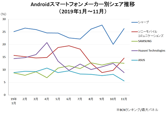 全国の家電量販店やECショップのPOSデータを集計する「BCNランキング」によると、2019年1月~11月のAndroid搭載スマートフォン(スマホ)のメーカー別販売数量シェアでトップに立っているのは、2年連続No.1に輝いているシャープだ。同社は冬商戦に向けて新製品「AQUOS sense3」シリーズを投入し、3年連続No.1に王手をかける。