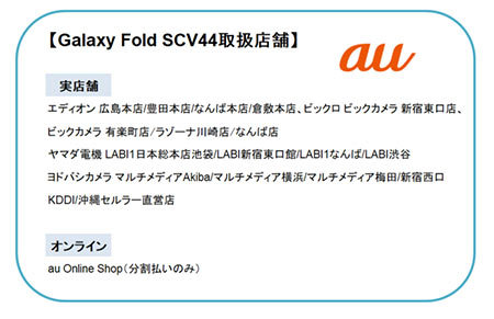 なお、取扱店舗は、au Online Shopと全国の主要都市にあるKDDI・沖縄セルラー直営店、Galaxyブランドの専門店「Galaxy Harajuku」、大手家電量販店のエディオン・ビックカメラ・ヤマダ電機・ヨドバシカメラの旗艦店に限られている。