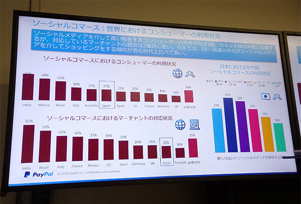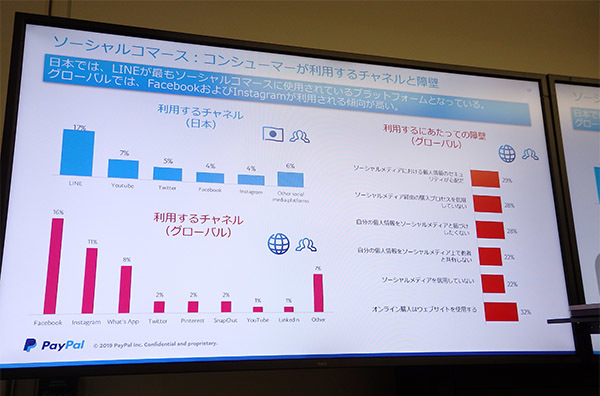 オンライン決済サービスのPayPalが世界11カ国のユーザー2万2000人と企業4600社に実施した「モバイルコマースに関するグローバル調査2019年版」によると、SNSを使った買い物(ソーシャルコマース)のサービス別利用状況は、海外でFacebook(18%)、Instagram(11%)、What’s App(8%)、Twitter(2%)という順で人気だったが、日本でLINE(17%)、YouTube(7%)、Twitter(5%)、Facebook(4%)となり、日本ならではの状況が際立つ結果となった。