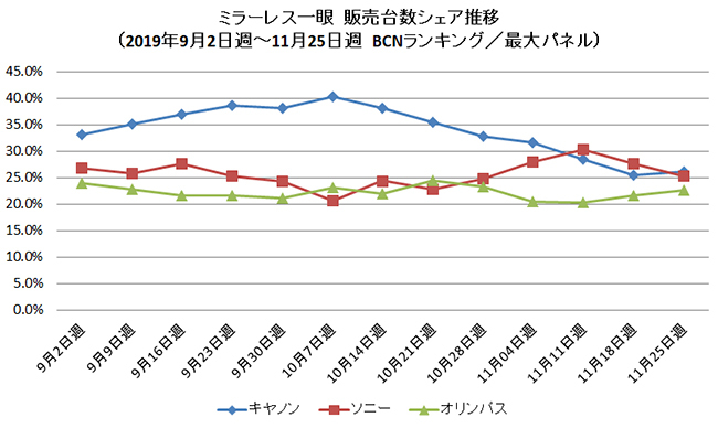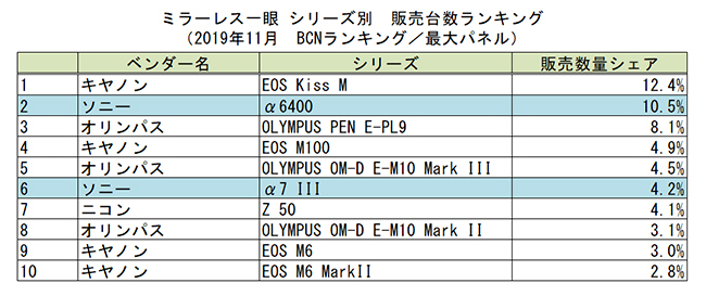 シリーズ別ランキングでは、キヤノンの「EOS Kiss M」がトップを死守したが、2位に迫るソニーの「α6400」が差を1.9ポイントまで縮めている。同社はフルサイズ機の「α7 III」も10月よりシェアを上げている。また、11月22日に発売したニコンの「Z 50」がトップテン入りしているのも注目すべきポイントだ。(BCN・大蔵 大輔)