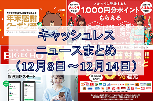 12月も中旬に突入し、立て続けの忘年会で財布が悲鳴をあげている人もいるかもしれない。スマートフォン(スマホ)決済サービス各社は、こうした需要に応えるキャンペーンを展開している。賢く活用して年末年始を乗り切りたいところだ。12月8~14日で話題になったキャッシュレスニュースを振り返る。