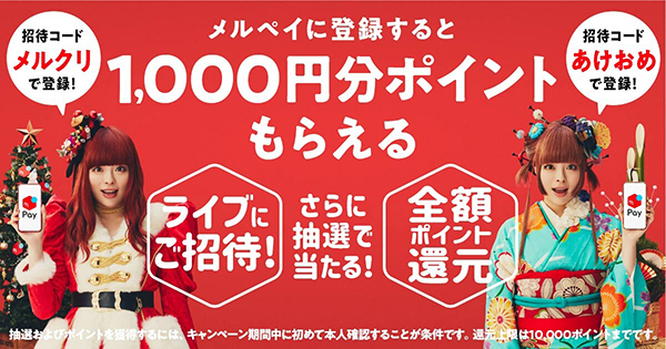 メルペイは、12月9日に「友達招待キャンペーン すすメルペイ第2弾」の年末年始限定企画として、「あけおメルクリ」キャンペーンを実施。キャンペーン期間中、特別招待コード「メルクリ」または「あけおめ」を入力して初めて「メルペイ」の本人確認(支払い用の銀行口座登録でも可)を済ませたユーザーに1000ポイントを付与する。