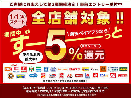 楽天ペイは20年1月1日9時から「【第2弾】楽天ペイアプリのお支払いで最大5%還元」キャンペーンを実施する。エントリー必須で、12月4日から事前エントリーを受け付けている。対象は楽天ペイを導入する全店舗。期間は3月2日9時59分まで。