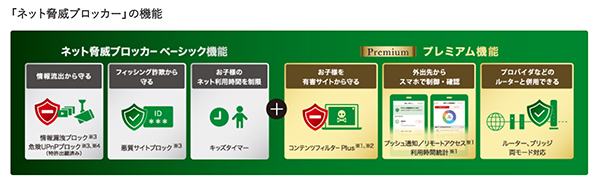 「危険UPnPブロック」のほかにも、フィッシング詐欺サイトにアクセスしようとしたらブロックする機能や、指定の時間以降はネットにつながらないようにするキッズタイマー機能も搭載する。また子供を有害サイトから守るためのフィルターがかけられる「コンテンツフィルター Plus」も搭載する。