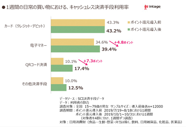 最も伸びが目立つのがQRコード決済という。8月の段階では1週間での利用率は10.1%であったが、ポイント還元導入後は7.3ポイント増えて17.4%とのことだ。電子マネーでの決済も約5ポイントの増加が見られ、変化がなかったカード(クレジット・デビット)の利用率(43%)に迫る勢いであることも分かった。