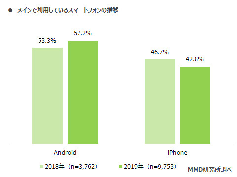同調査は、MMD研究所が15歳~69歳の男女9753人を対象に11月に実施した「2019年12月 iPhone・Androidシェア調査」。この結果を「2018年8月 モバイルデバイスシェア調査」で聴取したスマホ利用者のみを再集計した結果と比較すると、ほぼ1年でAndroidは3.9ポイント増、iPhoneは3.9ポイント減と、徐々に乗り換えが進んでいることが明らかになった。