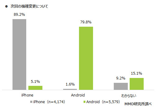 一方、Androidユーザーは79.8%が「次もAndroid」と答え、5.1%がiPhoneに乗り換えようとしていた。残りの15.1%は「わからない」と回答している。