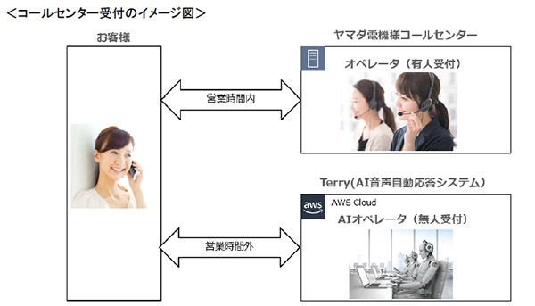 ヤマダ電機は、産業技術総合研究所(産総研)発のベンチャー企業であるHmcomm(エイチ エム コム)社のAI音声自動応答システム「Terry(テリー)」を使った夜間の出張修理受付業務を2019年度中に自社コールセンターに導入する。同システムは、アマゾンのクラウドサービスAWS(アマゾン ウェブ サービス)で運用されている。