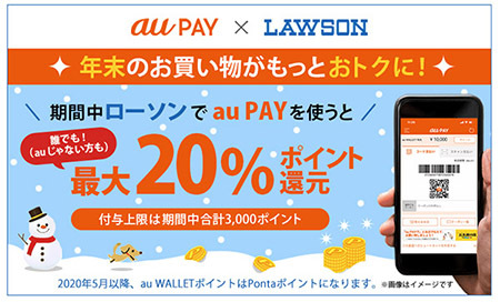 2020年5月以降にau PAYと共通ポイント「Ponta」を融合することを12月16日に発表したKDDIとローソンは、さっそく12月20日~31日23時59分の期間で最大20%のポイントを還元する「ローソンでau PAY決済を使うと最大20%ポイント還元キャンペーン!」を開始した。auの有料会員以外でも19%のポイント還元が受けられる。