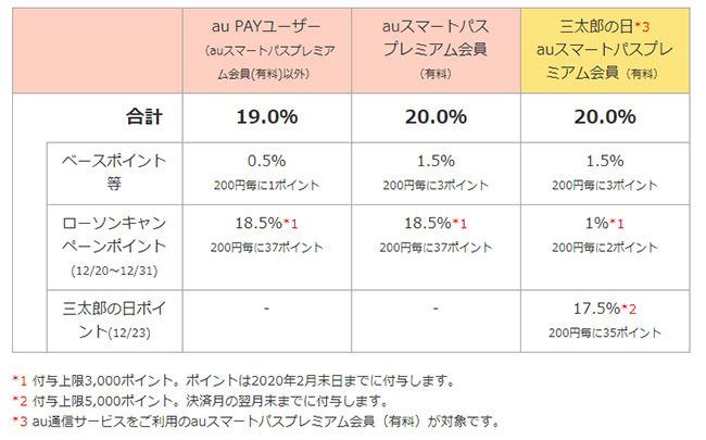 ローソン、ナチュラルローソン、ローソンストア100でau PAYで決済すると、auスマートパスプレミアム会員は決済額の最大20%相当の「au WALLET ポイント」が還元される。有料会員以外のau PAYユーザーは19%相当のポイントが還元される。このau WALLET ポイントは2020年5月以降にPontaポイントになる。