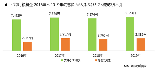 MMD研究所が「大手3キャリア・格安スマホ(MVNO)別月額料金の推移(2016年~2019年)」の調査結果を発表した。同調査は、過去の調査をもとに、スマートフォン利用者が通信会社に支払っている月額利用料金を集計して推移をまとめたもの。18年8月に菅義偉官房長官が携帯料金について「4割程度下げる余地がある」と発言して以降、値下げを図る動きがあったが、実際に支払っている平均料金は増加していた。