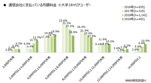 大手3キャリアユーザーの月額料金は、16年から見てみると「6000円以上8000円未満」「8000円以上1万円未満」が毎年減少している。同時に「1万円以上」が徐々に増加しており、平均料金を引き上げている。