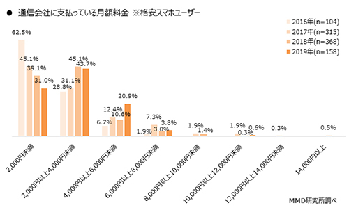 MVNOユーザーの月額料金は、「2000円未満」が毎年減少、「4000円以上6000円未満」が増加しており、格安スマホユーザーは毎月の月額料金が増加する傾向があると分かった。