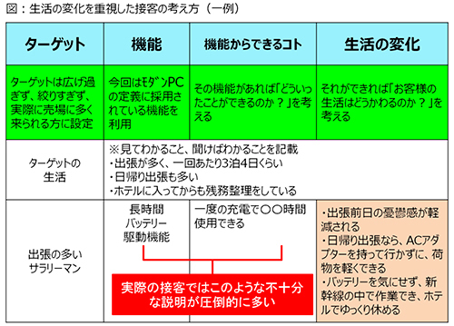 図には、代表的な機能と、その機能からできること、そして生活の変化に関する考え方の一例を記載しているので、接客時の参考にしていただきたい。一人ひとり感じ方が違うお客様に刺さる接客こそが、単価UPの秘訣である。