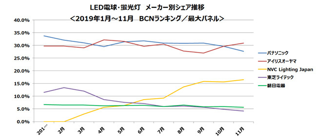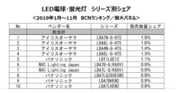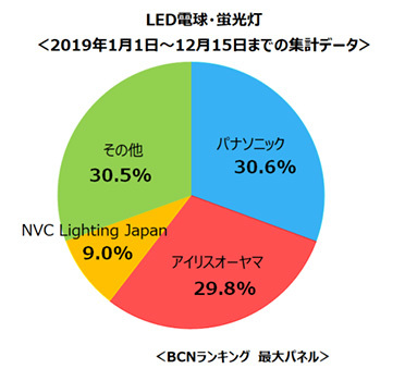 年末の大掃除需要で沸くLED電球市場で、今年もパナソニックとアイリスオーヤマの激しいバトルが繰り広げられている。全国の主要家電量販店・ネットショップのPOSデータを集計した「BCNランキング」で年間販売台数No.1ベンダーを称える「BCN AWARD 2019(2018年1月1日~12月31日)」では、アイリスオーヤマが初のトップに輝いたのだが、今年は1月1日~12月15日時点でパナソニックが30.6%で再び首位に立っている。追う立場のアイリスオーヤマは29.8%で、わずか0.8ポイント差。2社の戦いは、大詰めを迎えている。