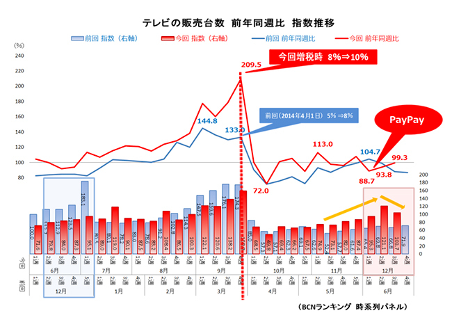 腰折れ感がハッキリ出ているのは、前回増税時の13年12月第1週を100としたときの指数推移を示す下の棒グラフ。11月第2週から4週連続で順調に上向いていたが、12月第3週は前週の121.1から17.4ポイントダウンの103.7に急落した。