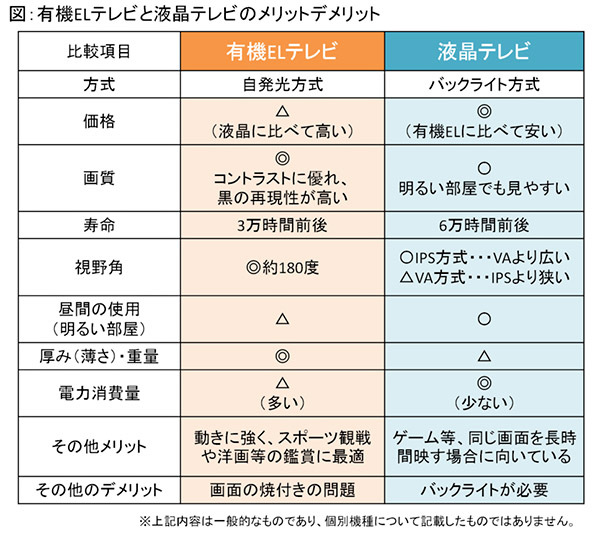 液晶テレビは、長寿命で明るい部屋でも見やすく、同じ画面を表示していても焼き付きが起こりにくい。有機ELに比べて、低価格だがバックライトを使っているため、厚くなりやすく重量があり、視野角も狭い。