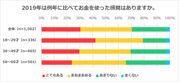 2019年、例年に比べてお金を使った感覚があるかどうかを聞いたところ「とてもある」「まあまあある」との回答を合わせて70.4%。年代別で見ると、10~20代が79.2%、30~40代が69.5%、50~60代が65.9%と、年齢が下がるにつれてお金を使った感覚がある人が増える結果という。