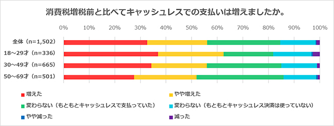 また、消費増税前と比べて、クレジットカードや電子マネー、スマートフォン決済などのキャッシュレスでの支払いが増えたかどうかを聞いたところ、「増えた」「やや増えた」との回答が56.1%。ポイント還元キャンペーンも影響したのか、キャッシュレス決済が増えている傾向が見てとれる結果とのことだ。