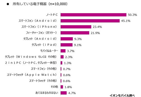 具体的には、50~79歳の男女1万人のシニアに予備調査として現在所有しているデバイスについて聞いたところ(複数回答可)、最も多かったのが「ノートPC」で50.3%、次いでスマホの「Android」が45.1%、「iPhone」が23.4%という。複数回答を再集計してスマホ所有者の割合を見ると、67.6%だったとのことだ。