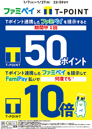 Tポイント・ジャパンは1月7~27日の期間、全国のファミリーマート店舗(一部店舗除く)で、Tポイントがもらえる「ファミペイ×Tポイント」キャンペーンを実施する。
