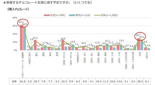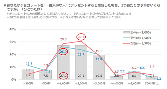 チョコを贈る一番大事な人は、「配偶者(パートナー)/恋人」が最も多く、女性57.3%、男性61.4%だった。一番大事な人に対して、男性が「1000円以下」、女性が「2000円以下」のチョコをプレゼントしたいと思っている。
