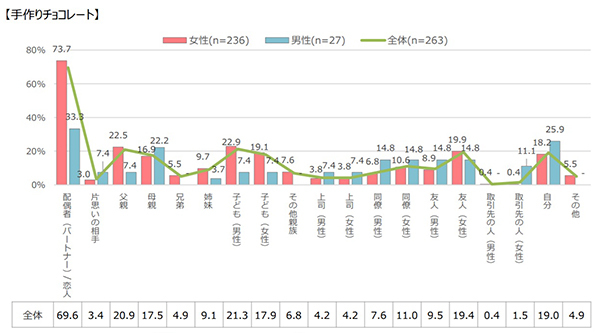 男女ともに、購入したチョコを配偶者や恋人に送る割合は約6割で最も高い。自分用に準備する割合は、女性と男性ともに高い傾向がみられる。手作りのチョコレートも、渡す相手に大きな差が見られなかった。
