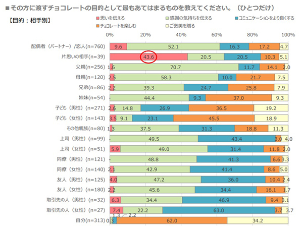 片思いの相手にチョコを渡す目的は、「思いを伝える」(43.6%)が高かった。配偶者や家族(子ども以外)、自身の職場関係者、友人に渡すのは「感謝の気持ちを伝える」が高く、子どもや自分に渡す理由が「チョコレートを楽しむ」ため。