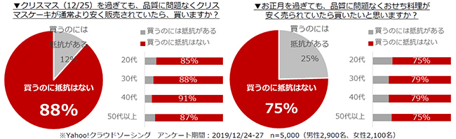 Yahoo!クラウドソーシングが実施した「クリスマスや正月の後でも安ければケーキやおせちを購入するか」という調査によると、「買うのに抵抗はない」との回答は全体の75%以上。大半が盛り上がり後の在庫処分に関心を持っていることが分かった。