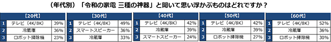 同社が実施した全国20~60代の男女600人を対象に行った調査結果によるもの。令和の家電 三種の神器と聞いて思い浮かぶものをあげてもらう設問で、4K/8Kテレビが45%、冷蔵庫が37%、ロボット掃除機が27%と上位だった。特に、4K/8Kテレビはどの世代でもトップになった。