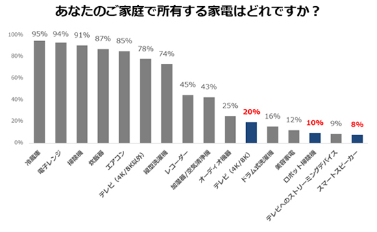 「家庭で所有する家電」の設問では、冷蔵庫(95%)や電子レンジ(94%)、掃除機(91%)がほぼ所有されているものの、4K/8Kテレビ(20%)やロボット掃除機(10%)、スマートスピーカー(8%)がまだ低いことが分かる。
