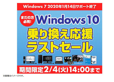 ユニットコムは、パソコン工房ウェブサイトで、1月8日から2月4日14時までの期間限定で「Windows 10 乗り換え応援ラストセール」を実施している。