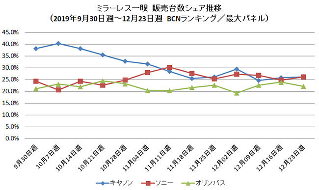 メーカー別では上位陣が軒並み低調で、11月は唯一前年を超えていたソニーも77.7%と前年を下回った。12月の各週のメーカー別販売台数シェアを追うと、キヤノンとソニーが抜きつ抜かれつのトップ争いをしており、そのすぐ後からオリンパスが迫ってきていることが分かる。10月時点ではキヤノンが40%を超える週もあったが、ここ2カ月で3社の差はかなり縮まった。