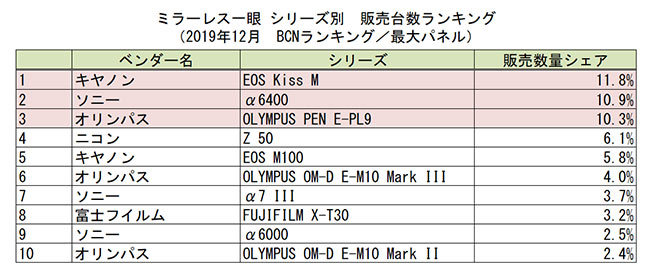 シリーズ別ランキングでは、キヤノン「EOS Kiss M」がトップを守ったが、2位のソニー「α6400」、3位のオリンパス「OLYMPUS PEN E-PL9」もシェアを2ケタに伸ばしており、かつての大きなアドバンテージはなくなりつつある。また、11月末に発売したニコン「Z50」も4位にランクインするなど、健闘している。(BCN・大蔵 大輔)