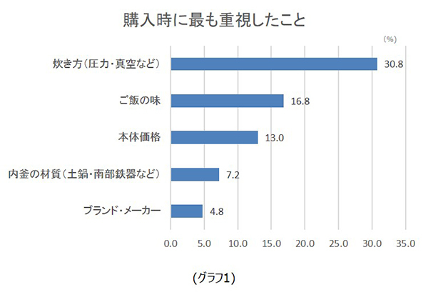 購入時に重視したポイントは、圧力や真空など「炊き方」(30.8%)が最も多く、次に「ご飯の味」(16.8%)、「本体価格」(13.0%)、「内釜の材質(土鍋・南部鉄器など)」(7.2%)、「ブランド・メーカー」(4.8%)となった。