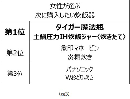 次回購入したい炊飯器は、第1位がタイガー魔法瓶の「土鍋圧力IH炊飯ジャー 〈炊きたて〉」、第2位が象印マホービン「炎舞炊き」、第3位がパナソニックの「Wおどり炊き」となった。
