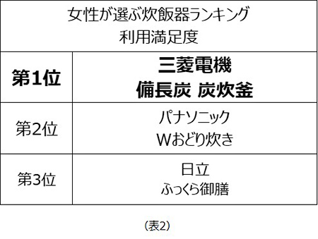 また、利用満足度では、第1位が三菱電機の「備長炭 炭炊釜」、第2位がパナソニックの「Wおどり炊き」、第3位が日立の「ふっくら御膳」となった。
