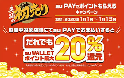 au PAYは、「家電量販店限定『au PAYでau WALLETポイントもらえるキャンペーン』英雄の初売り」を開催中。対象の家電量販店でau PAYで決済すると20%分のau WALLET ポイントを還元する。
