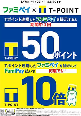 ファミリーマートのスマホ決済サービス「ファミペイ」は、Tポイントと連携したキャンペーンを実施中。Tポイント連携したファミペイを提示して買い物するとTポイント50ポイントが獲得できるほか、ファミペイを提示して200円以上のFamiPay払いでTポイントが10倍になる。たまったTポイントを、全国のTポイント提携先で1ポイント1円分として利用できる。エントリー不要で、累計1000ポイントが上限となる。