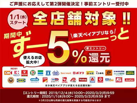 楽天ペイは1月1日に「【第2弾】楽天ペイアプリのお支払いで最大5%還元」キャンペーンを開始。導入する全店舗なのがポイントだ。