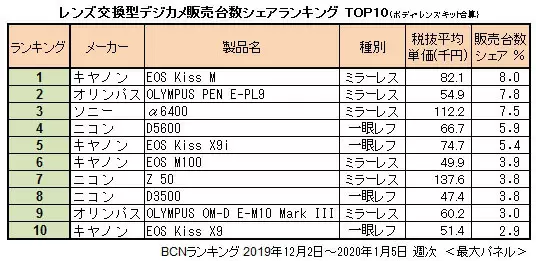 BCNランキングで19年12月2日~20年1月5日までの5週間、レンズ交換型デジカメの主要メーカー別販売台数シェアや販売台数同週比を集計した。12月2日週(12月2~8日)では、レンズ交換型デジカメの販売台数が前年同週比44.4%と大きな落ち込みを示した。