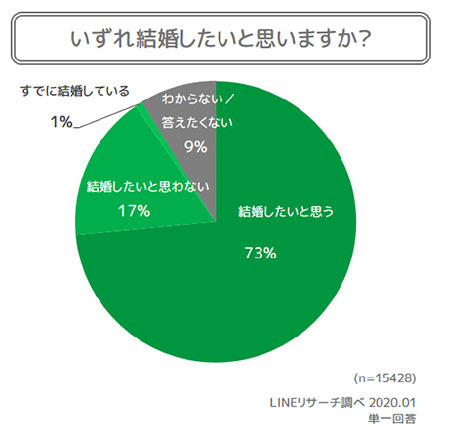 LINEリサーチは、アンケートモニターの中で20年度に新成人になる1万5428人(99年4月2日から00年4月1日生まれ)を対象に調査を実施した。「いずれ結婚したいと思いますか」という質問に対しては、73%が「結婚したいと思う」と回答。「結婚したいと思わない」割合は17%という結果で、男女差もなく男女共に結婚に前向きな傾向があることが分かった。