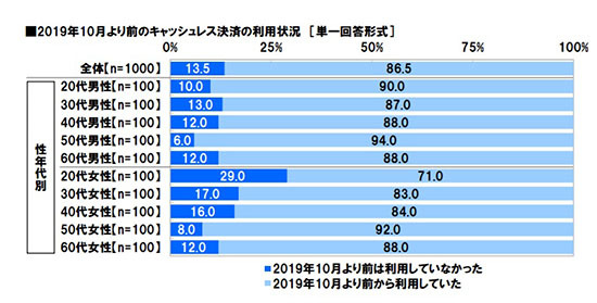 全回答者(1000人)に、増税となった2019年10月より前にキャッシュレス決済を利用していたかを聞いたところ、「19年10月より前にキャッシュレス決済を利用していなかった(新規利用層)」が13.5%、「19年10月より前にキャッシュレス決済を利用していた(継続利用層)」が86.5%だったという。新規利用層の割合を性年代別にみると、20代女性(29.0%)が最も高く、50代男性(6.0%)と最も低かったという。