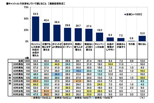 また、全回答者にキャッシュレス決済をしていて感じることを聞いたところ、「キャッシュレス決済対応のお店が増えた」(54.5%)が最も高く、次いで、「少額でも気にせず使える」(40.4%)、「ポイントがよく貯まる」(36.4%)、「会計がスピーディー」(29.6%)、「周囲に使う人が増えた」(28.7%)となった。