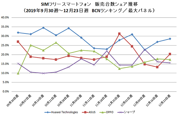 12月の週次でメーカー販売台数シェアの推移を分析すると、上位4社の混戦振りがうかがえる。毎週、シェアが大きく変動し、順位が入れ替わった。今秋以降はASUS、シャープ、OPPOの2位争いが熾烈になり、1位をキープしているファーウェイとの差も詰まってきている。