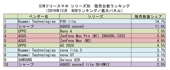シリーズ別ではファーウェイの「HUAWEI P30 lite」が14.7%で首位に。シャープの「AQUOS sense3」が3.1ポイント差で追う。3位はOPPOの「OPPO Reno A」、4位はASUSの「ZenFone Max Pro(M1)」。各社の端末がベストテンに満遍なくランクインしている。