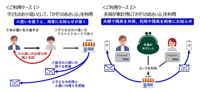 子どもの小遣いを含め、家計のお金の流れを「見える化」し、使い過ぎを防ぐ。具体的には家族で共有している家計を、かぞくのおさいふ一つに集約し、家計の管理者があらかじめ毎月における家族の利用予定額をクレジットカードでかぞくのおさいふに入金(チャージ)しておき、かぞくのおさいふから、小遣いや仕送りとして家族の「個々のおさいふ」に入金する。家族は、入金された範囲でVisaのプリペイドカードを利用して支払う。