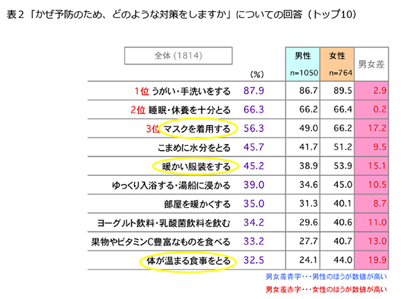 男女差に注目すると、全項目で女性が上回っていた。最も男女差が大きいのが「体が温まる食事をとる」、次いで「マスクを着用する」「暖かい服装をする」の順。多くの女性が、体の中から外から、温める(暖かくする)ことで、かぜ対策をしている。体力や免疫力を高めるという“温活”が注目されているが、女性には実践している人が多いようだ。