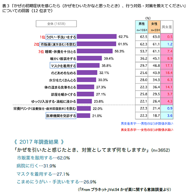 続いて2位は、「市販薬を飲む」。1位と僅差で、2017年の結果とほぼ同じく、6割超が回答した。これに比べ、「医療機関を受診する」は12位と、かなり差があった。病院へ行くほどではない初期症状への対策として、市販薬が強い味方になっているようだ。