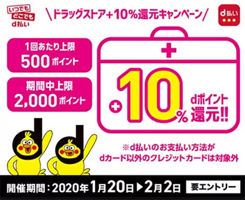 さらに、1月20日からは「ドラッグストア限定 d払い+10%還元キャンペーン」もスタート(2月2日まで)。付与上限は決済1回あたり500ポイント、期間中合計2000ポイント。こちらはdカード以外のクレジットカード払いは対象外になることに気をつけたい。